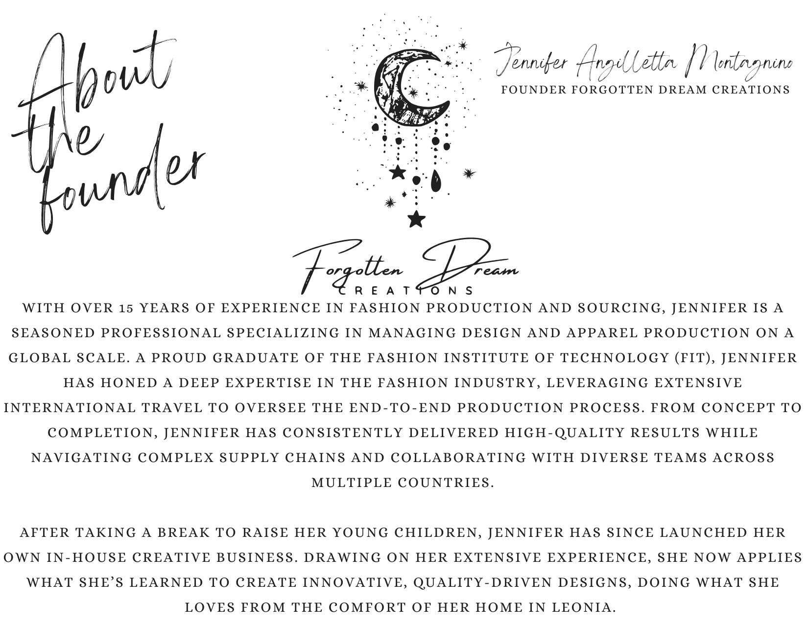About the founder: Jennifer Angiulletta Montagnino, founder of Forgotten Dream Creations, with a moon and star illustration at the top right.